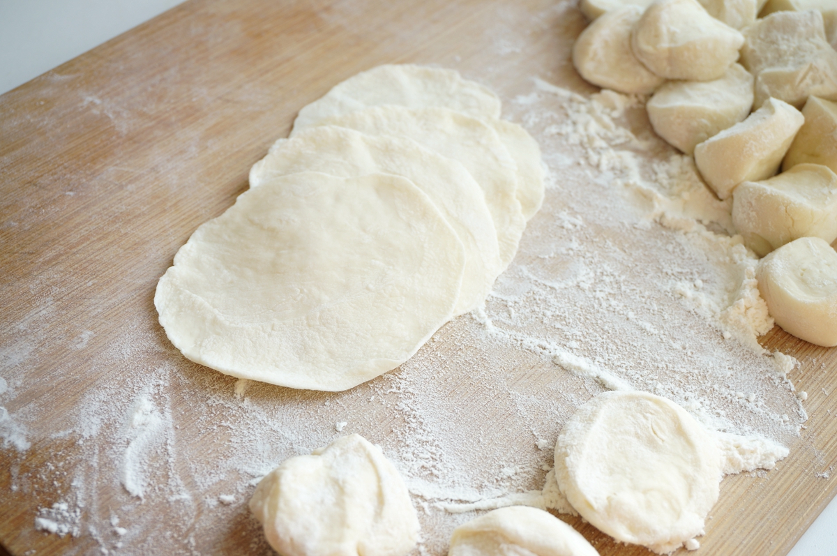 擀成中间稍厚、边缘略薄的圆皮,大小随自己喜欢;