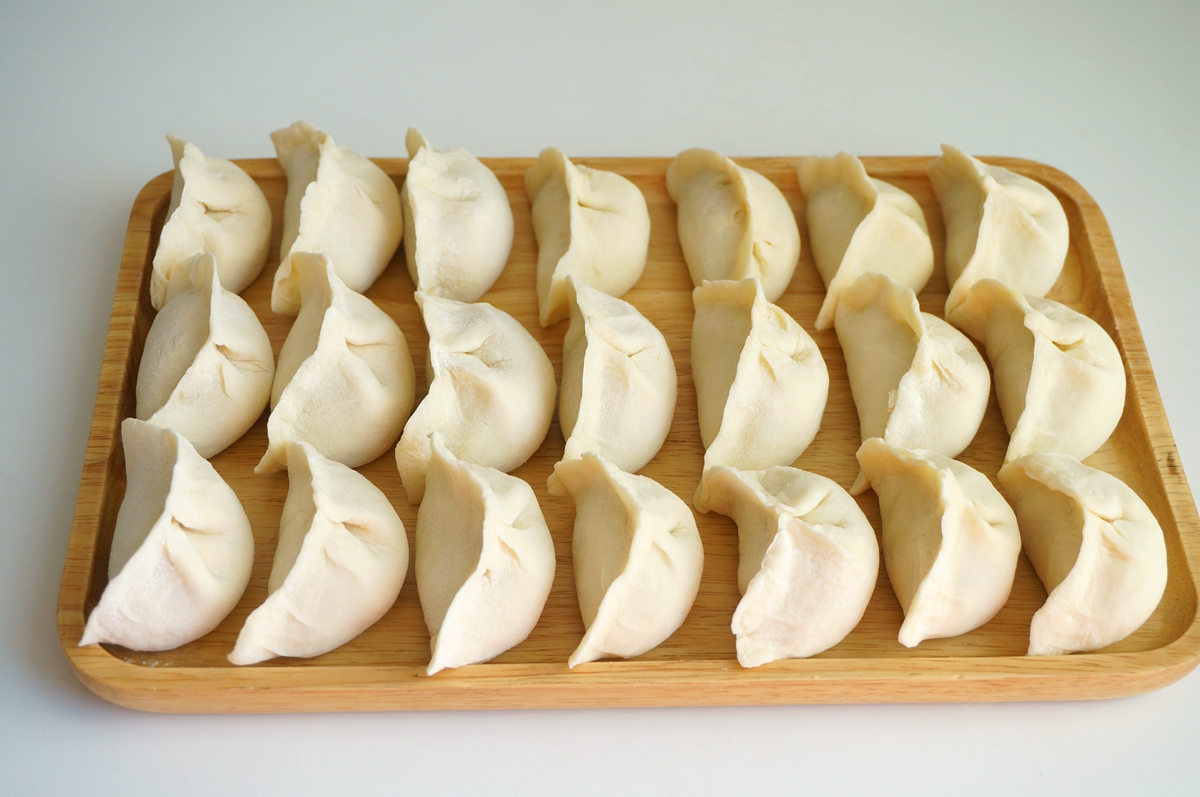 入开水锅中,中途在水沸腾时点少许凉水三次,待饺子肚子鼓鼓的,就可出锅了;