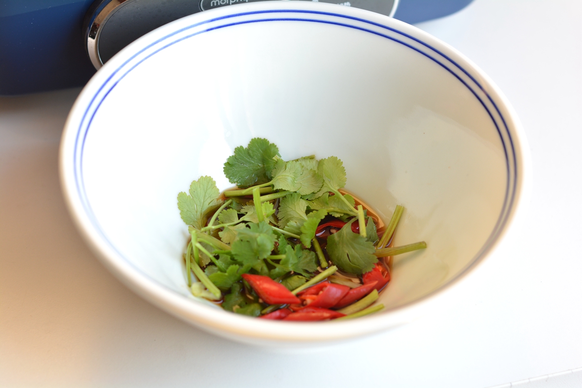 煮饺子时可调一个酸辣汁:香菜切寸段,朝天椒切圈,香醋、生抽、辣椒油同入碗中;