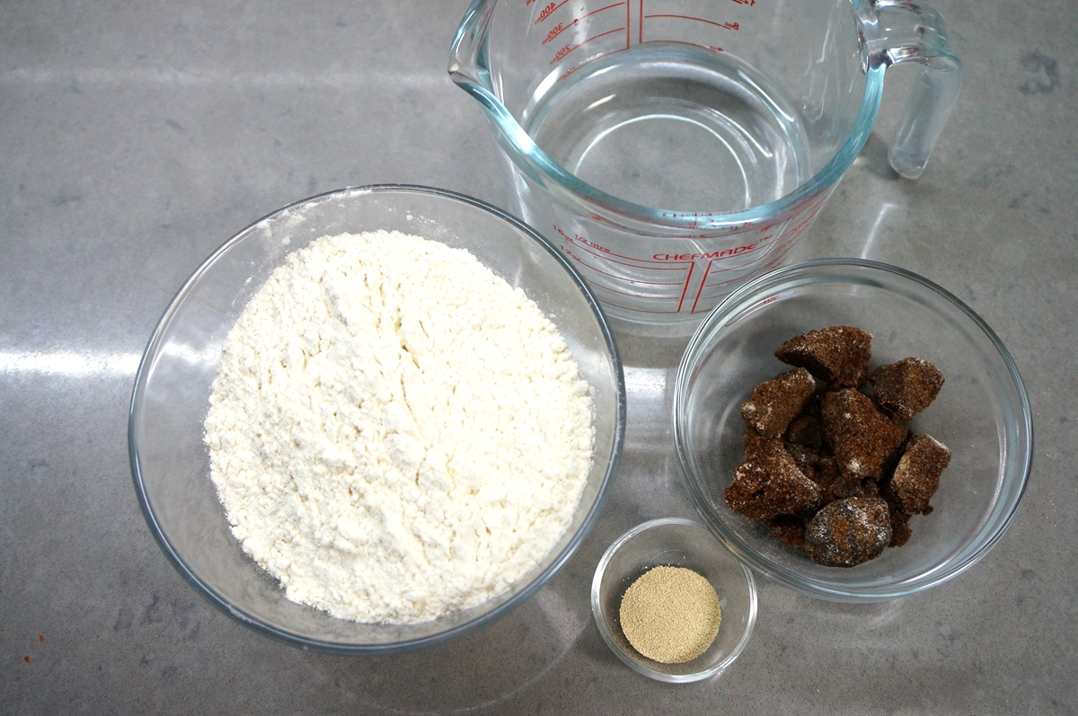 材料:中筋面粉200克,红糖50克,干酵母3克,热水105克