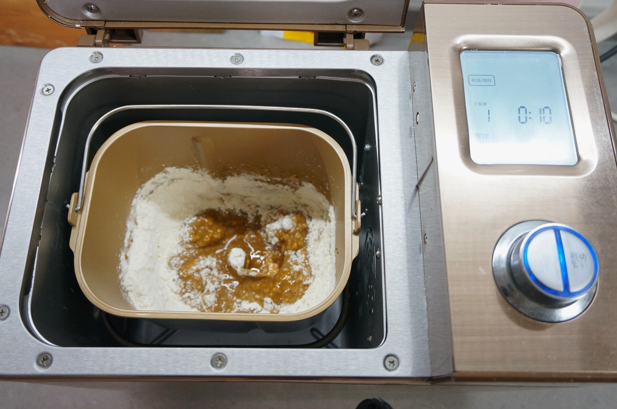 面粉、红糖水、酵母液同入面包桶中,将桶安放在东菱6D面包机中,启动揉面程序10分钟,如果没有面包机用厨师机或者手揉都可以;