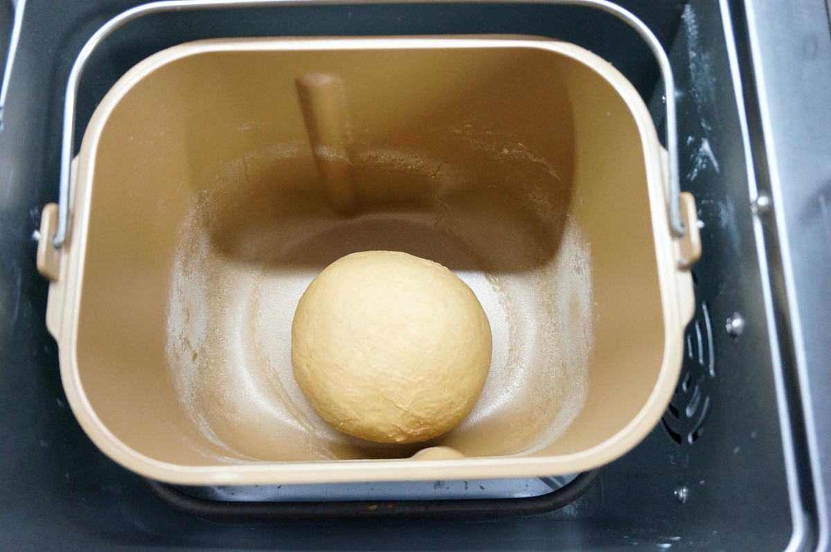 面团揉光滑后,取出搅拌棒,用手将面团收圆,放在桶中,盖一块湿布,合上盖子,选择发酵1小时,视面团状态来调整时间;