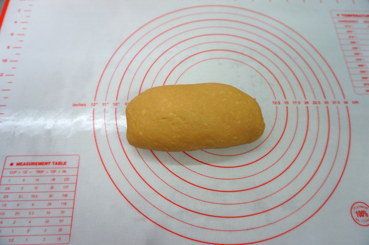 面团取出放在揉面垫上,因为面团的含水量不多,整体有些偏硬,所以无需再往里面搋面粉,只需采取折叠的方法揉一揉,排出面团中的气体就可以;