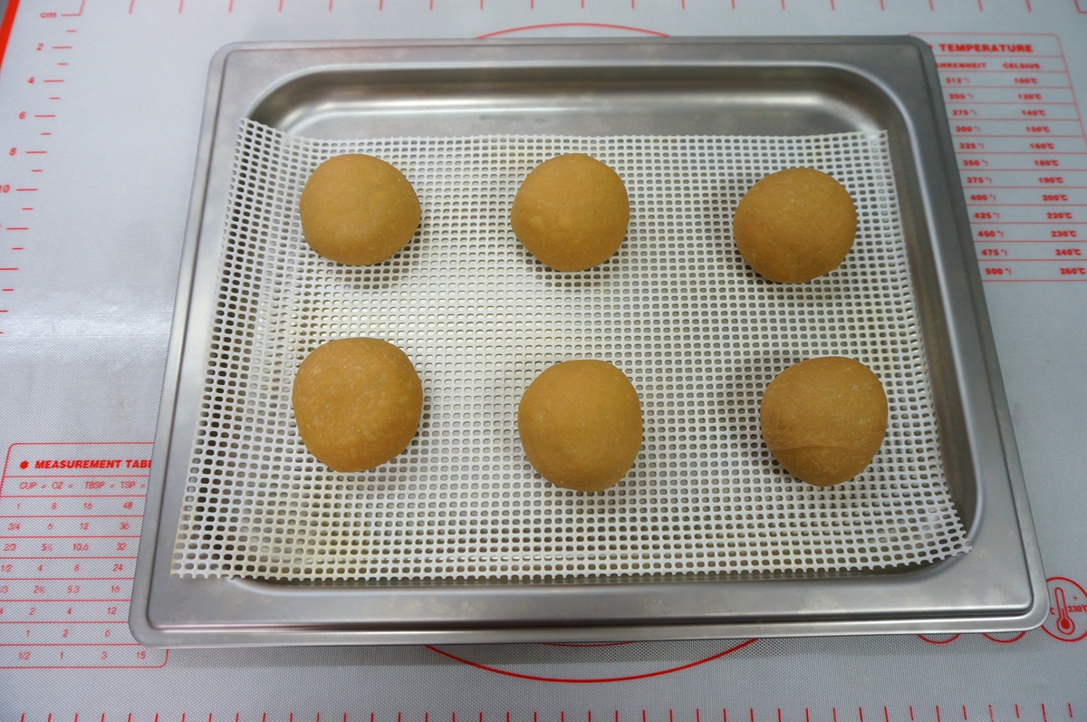 将面团分成大小均匀的剂子,再分别揉圆,码放在铺了蒸垫的蒸盘里,送入蒸箱中饧20分钟,生坯比原来略有增大且圆润些;