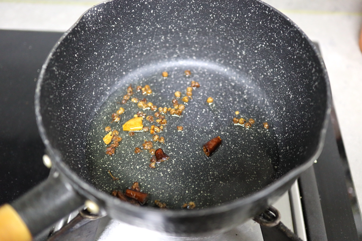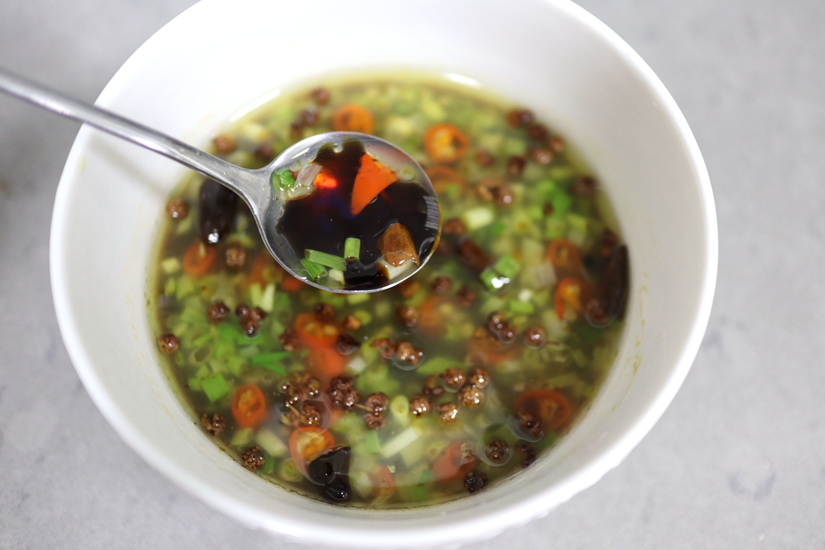 材料:鸡大腿1只,小米辣4个,香葱2棵,姜1块、油适量,生抽、香醋、花椒1撮,干红辣椒1个