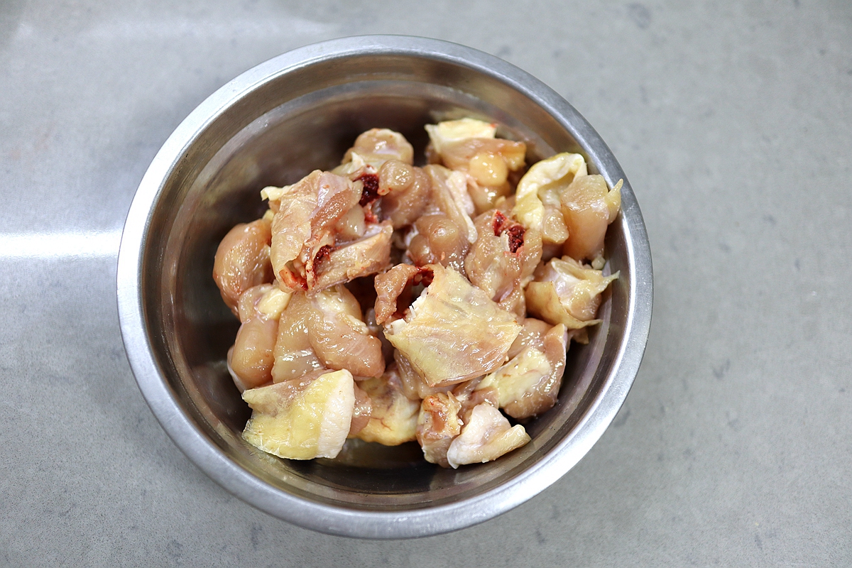 2. 鸡大腿用快刀剁成小块,每块约3、4公分大小,一定要用快刀,这样骨头碎渣会少很多,吃的时候不用担心划破嘴;