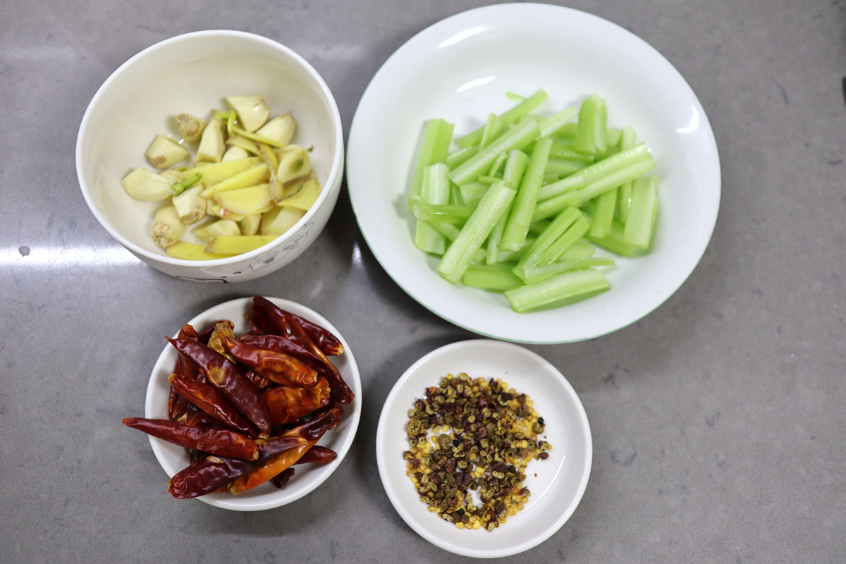 3. 大蒜头一切两半,姜切粗条,芹菜纵剖两条再切寸段,干红辣椒和麻椒准备好,能吃麻辣的可以加大量,不能吃的可少放;同样的配料想让成品更辣或者微辣,请看好后面的步骤;