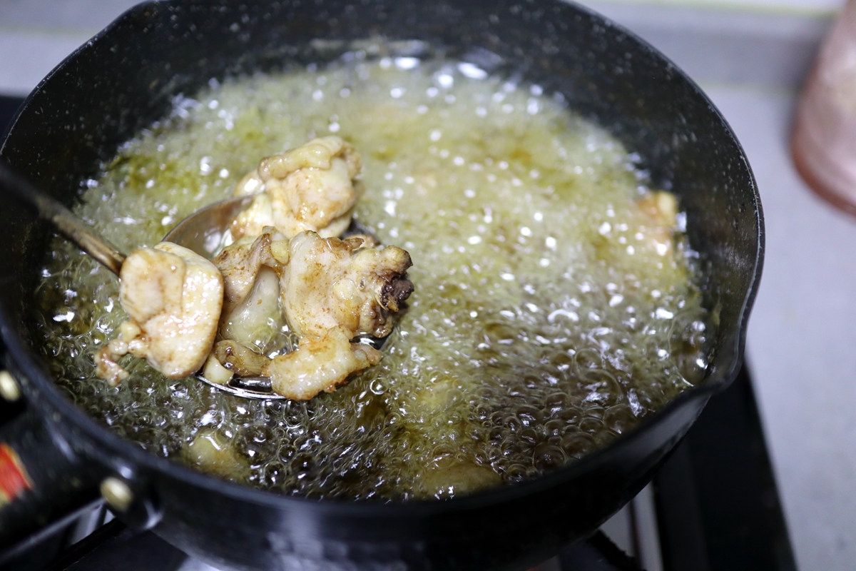 1. 鸡腿肉有弹性,剁成小块直接入油锅中炸,无需放淀粉;想吃干香的可多炸一会,让鸡肉触摸有硬感;想吃有弹性的可少炸一会儿,鸡肉中保留一点水分;