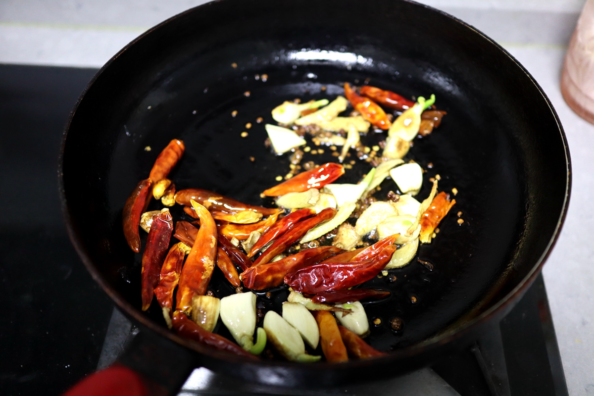 5. 另起一锅,舀一点炸鸡块的油,先将麻椒、大蒜、姜片入锅中翻炒出香味;再倒入干红辣椒;辣与微辣的关键在这里:想要更辣可以把辣椒剪断或者掰成两三块,能充分将辣腺中的辣味释放出来,不想太辣就整根放进锅中同炒微微变色;