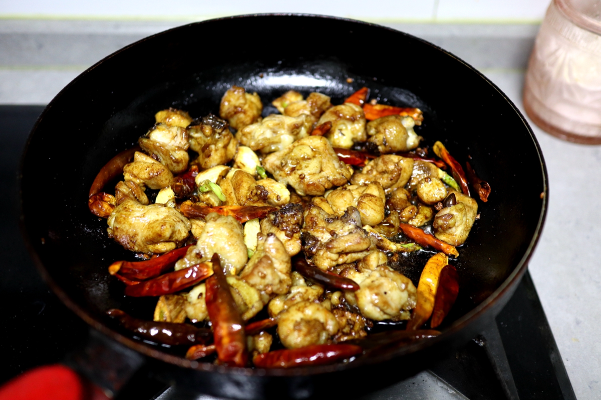 6. 将鸡丁入锅中翻炒,撒适量盐、酱油上色入味,因为要吃干香的,所以不要加水噢;