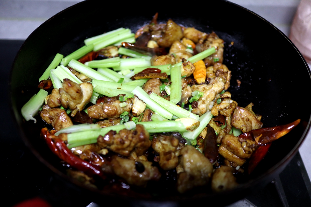 材料:鸡大腿1只,干红辣椒1盘,麻椒1碟,大蒜1头,姜1块,芹菜杆2根,香菜1棵,植物油适量,盐适量,酱油少许