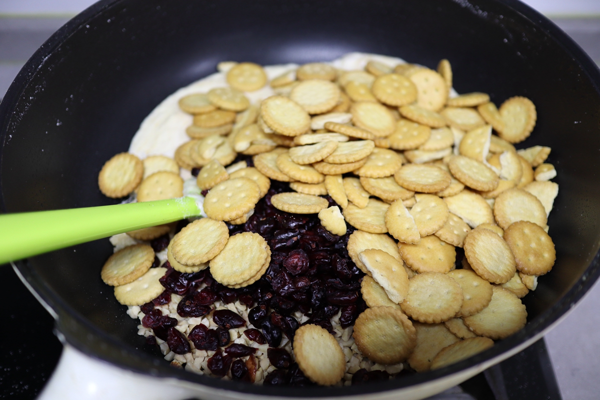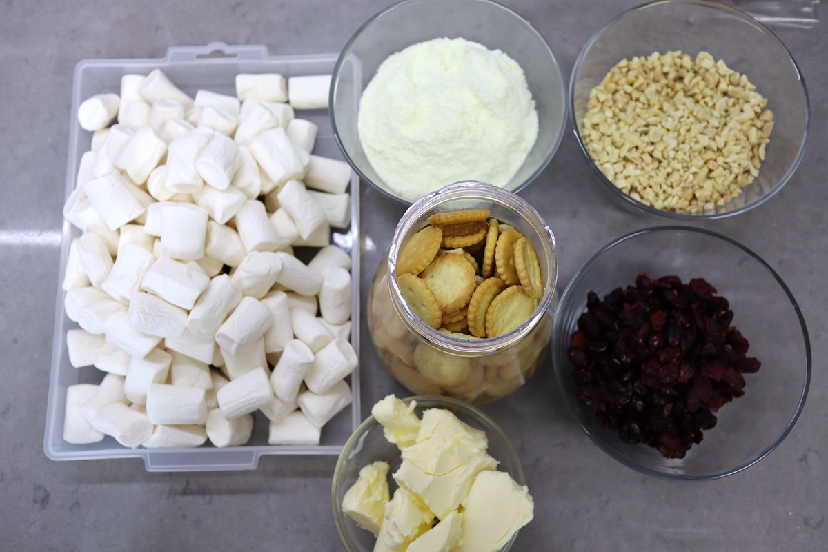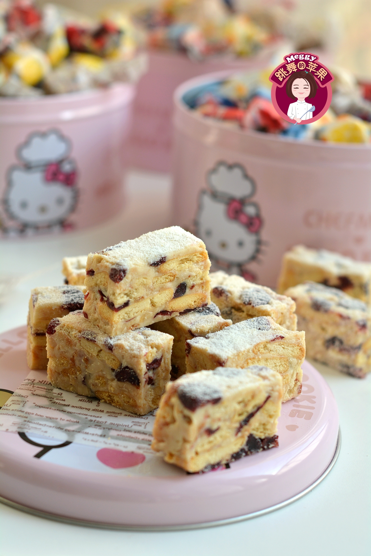 材料:棉花糖360克,黄油120克,奶粉130克,花生碎180克,蔓越莓干170克,小饼干280克