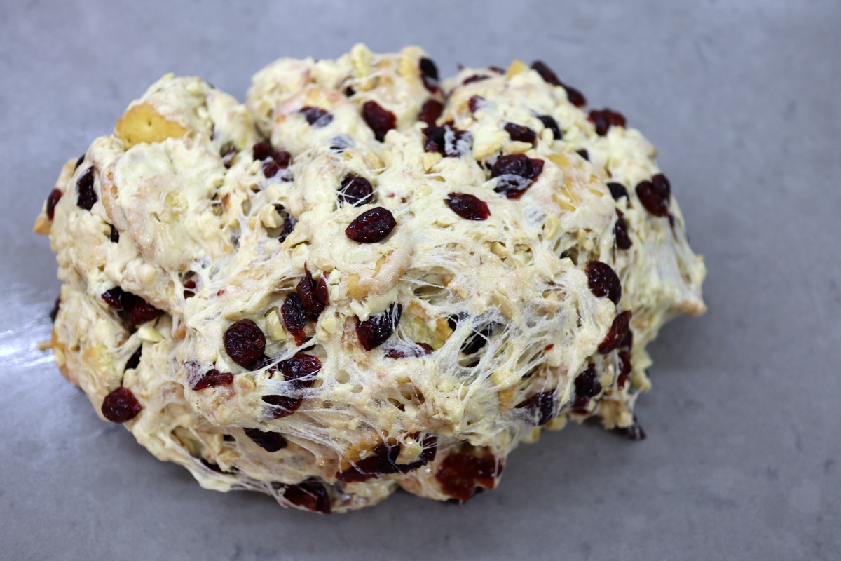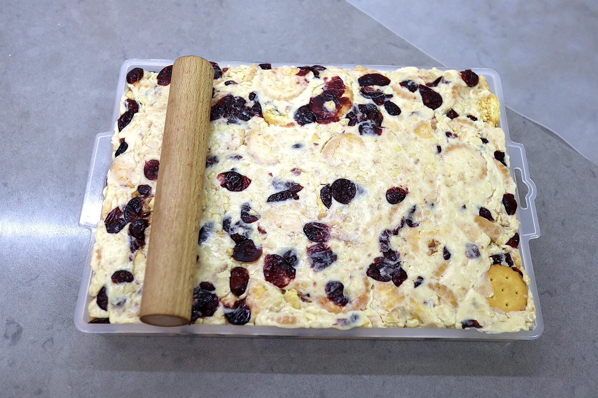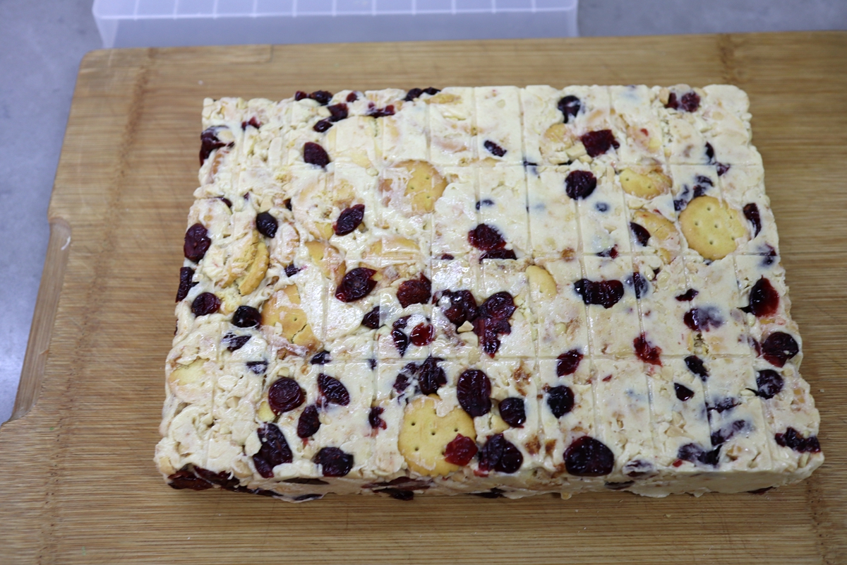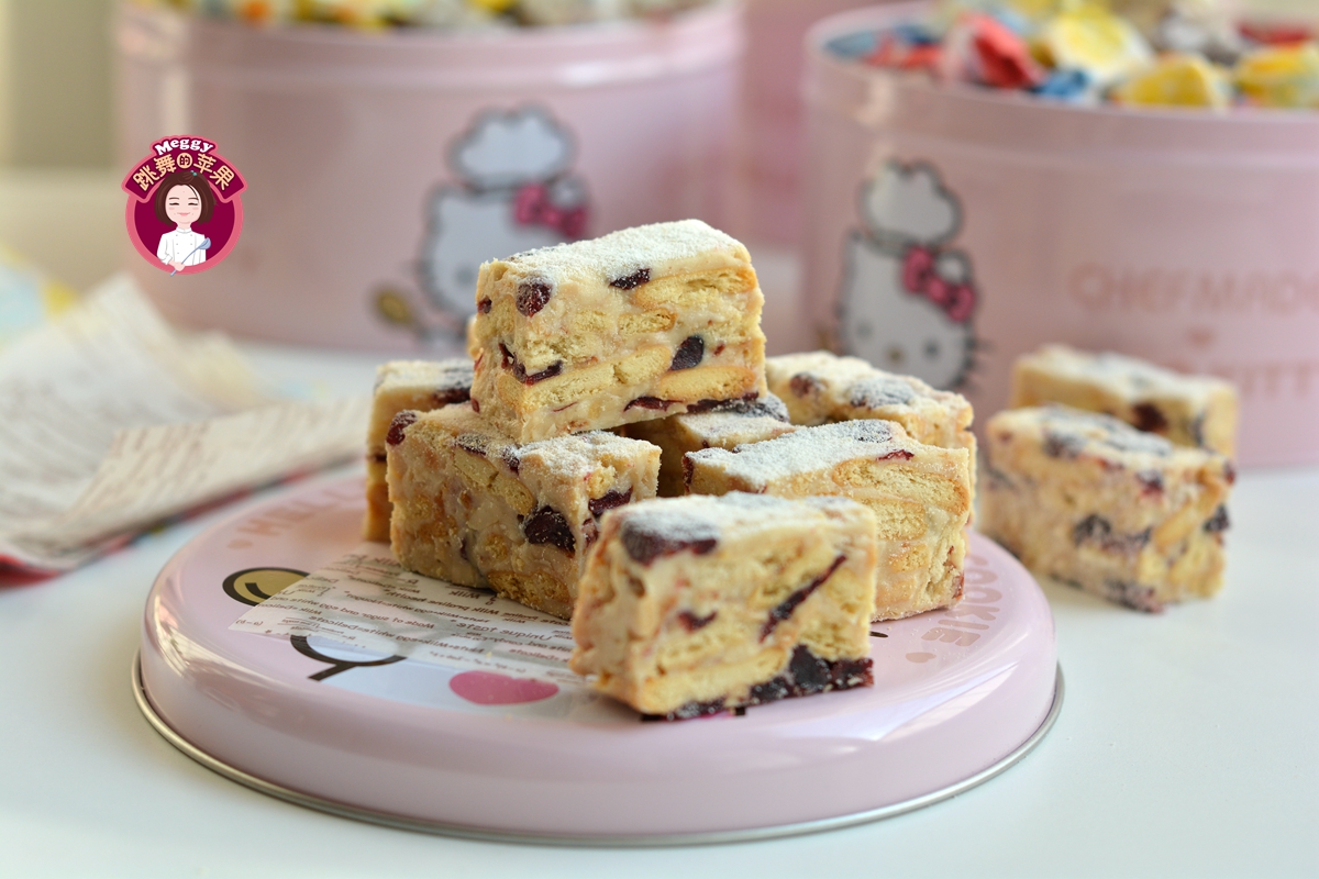材料:棉花糖360克,黄油120克,奶粉130克,花生碎180克,蔓越莓干170克,小饼干280克