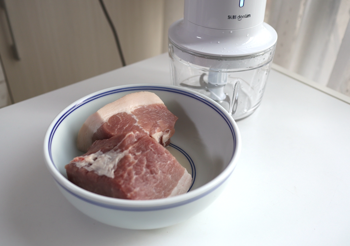 2. 肥瘦猪肉清洗干净,纯瘦肉并不好吃,带点肥的才香,我选的前臀尖,肉厚且嫩;