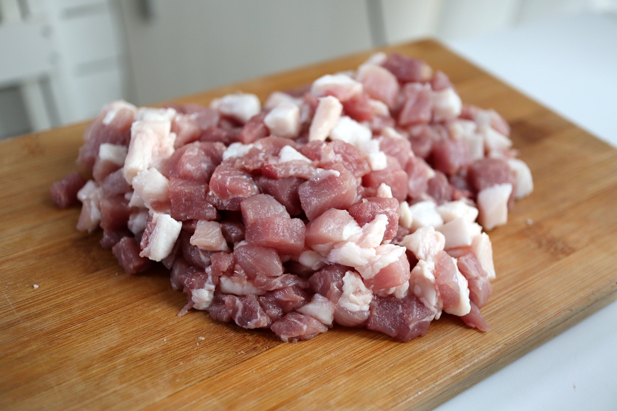 3. 猪肉切成2、3公分的丁,这个大小比较适合我的绞肉机;如果是手剁馅,建议切细条再切丁;