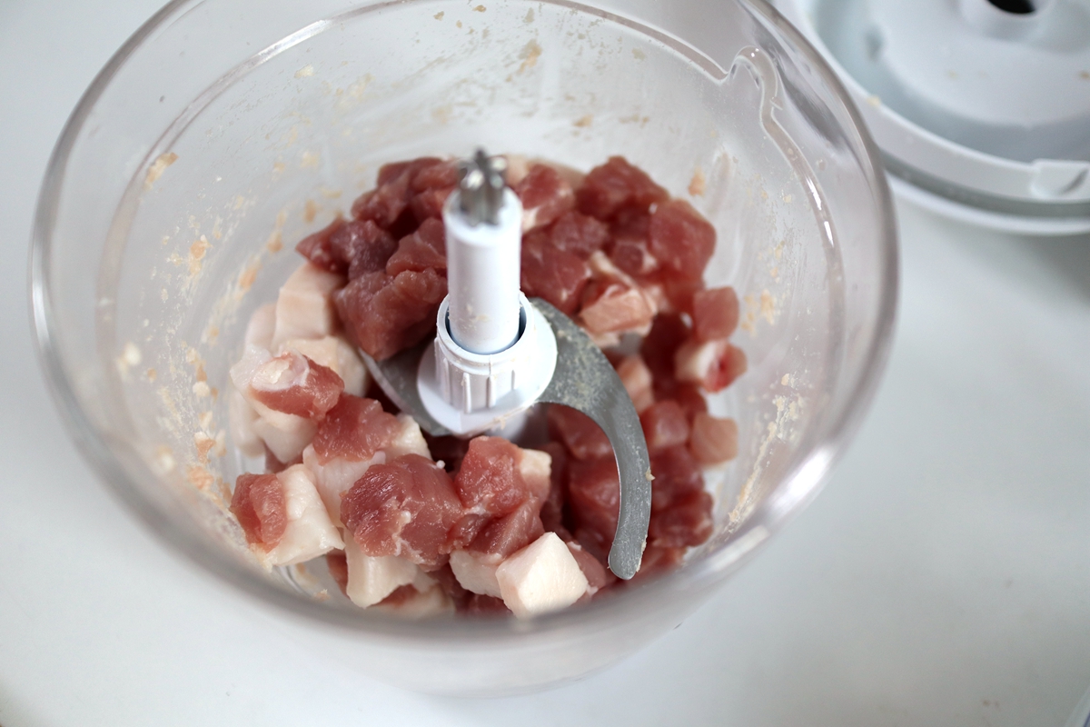 4. 将螺旋刀片提前装好,再把适量的肉丁放入绞肉机杯中;