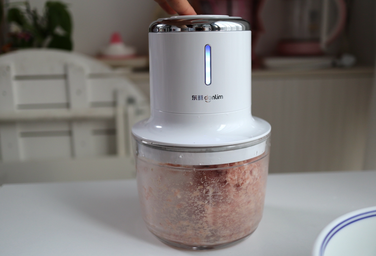 5. 盖上盖子,选择相应的功率将肉丁搅打成肉糜,粗细可依自己的喜欢通过调整时间来控制;
