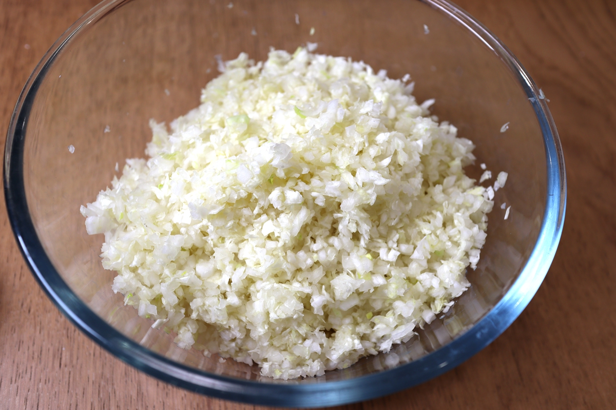 7. 白菜剁碎,入盆中,撒少许盐,用筷子搅拌均匀,静置10分钟;