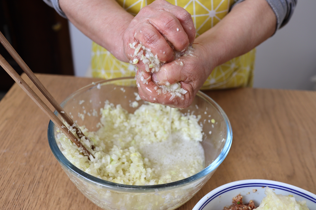 8. 双手攥住一把白菜,轻轻挤压出多余的白菜汁,不要挤得太干,因为肉馅中没有打水,使肉馅鲜嫩多汁就要多保留一些白菜汁;