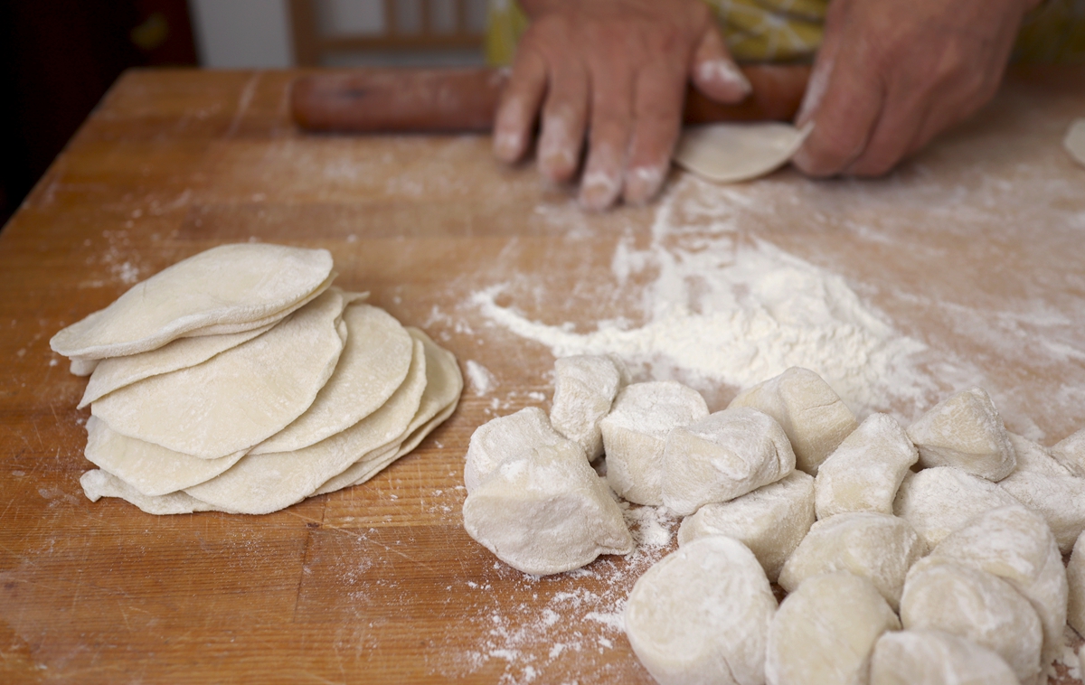 11. 取适量饺子馅放在圆皮上,按自己的手法或包或捏或挤成饺子;