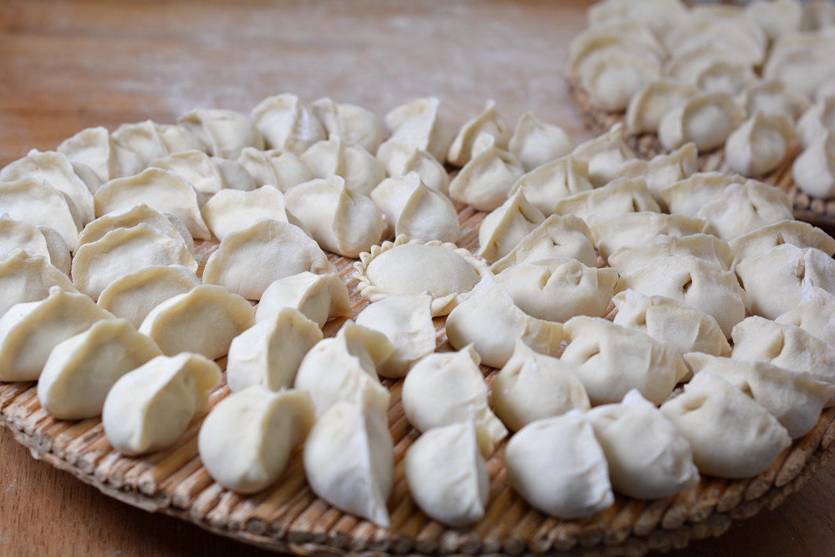 12. 所有的馅料全部包成饺子了,北京人喜欢最后包一个合子,也就是两张面皮上下一扣,捏严,再捏上花边,意为“和和美美”;原本是馅料包一个太大,包两个又太小,所以就包成合子,再来一个好寓意,真是智慧和文化的传承;饺子快包完时,可以烧一锅水,待饺子全部包好后水也开了,饺子下锅煮熟就等着吃啦;