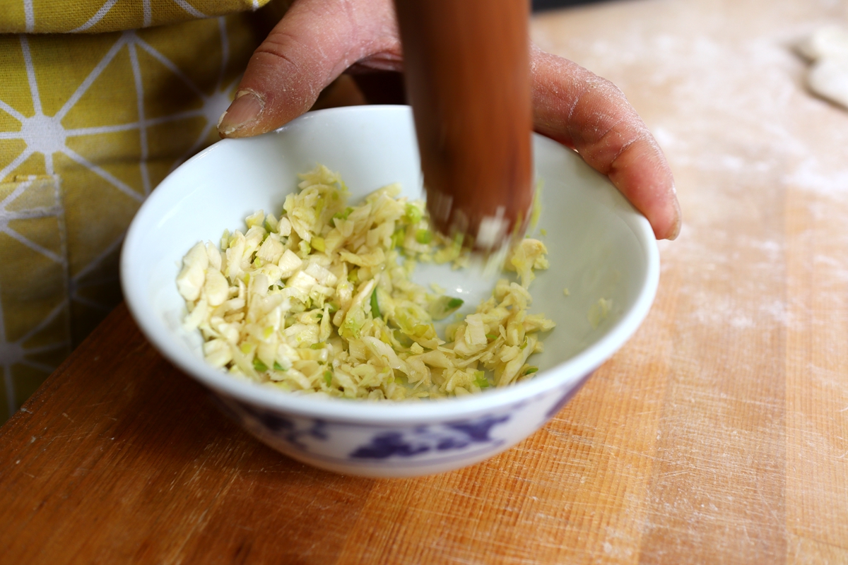 13. 趁着煮饺子的工夫,先用刀把大蒜瓣拍扁剁一剁,再入碗中用擀面杖的一端将大蒜砸成蒜泥;