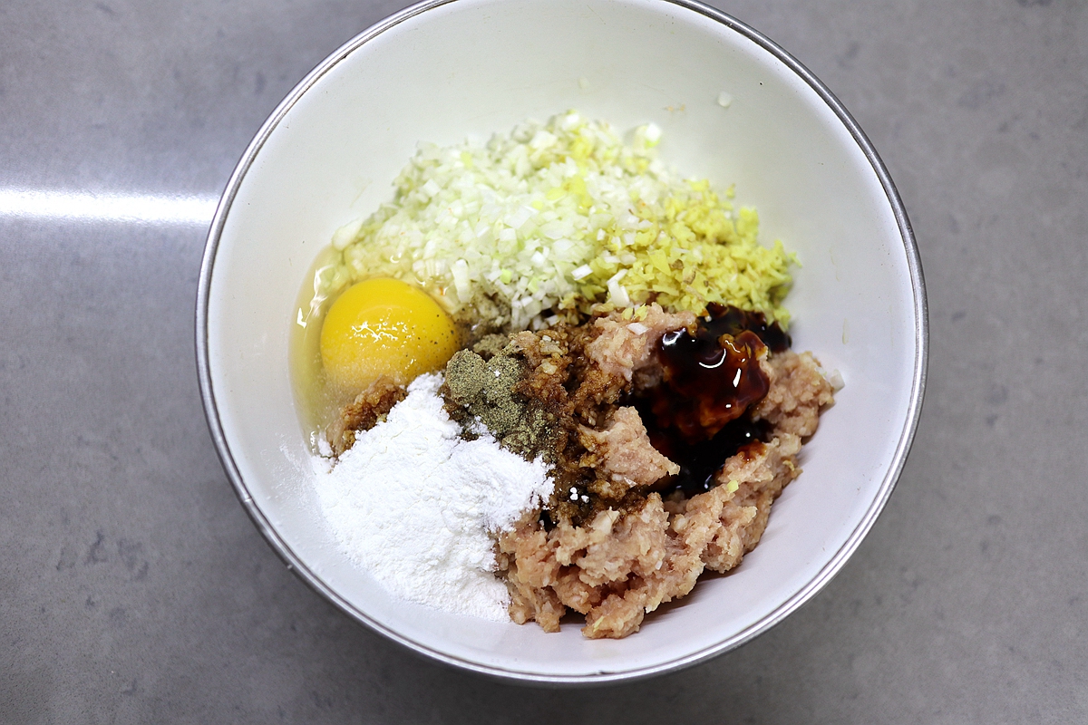 丸子材料:猪肉300克,咸蛋黄12个,鸡蛋1个,大葱1段,姜1块,黑胡椒粉3克,蚝油30克,酱油30克,盐2克,淀粉30克,凉水少许,油适量(实耗很少)
