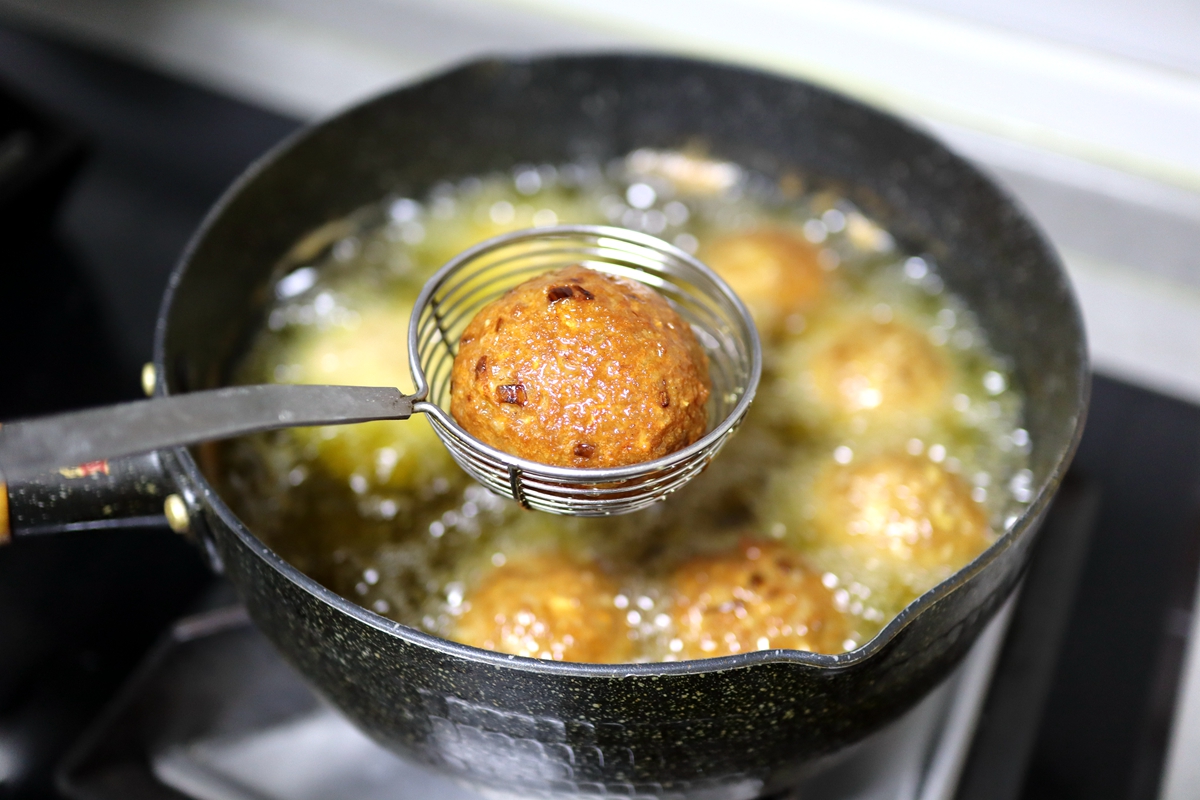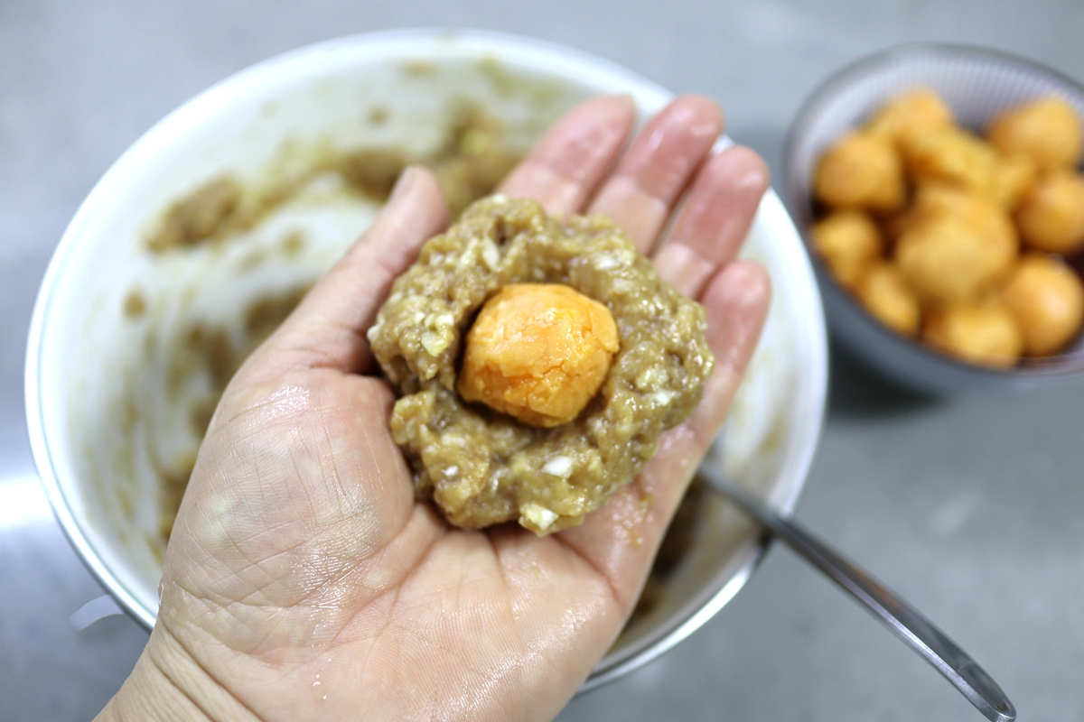 炸好的肉丸子外皮酥脆,内心香嫩;因为蛋黄是蒸熟的,嘴急的话可以直接吃,如果想要更香更漂亮,可以多加两步;