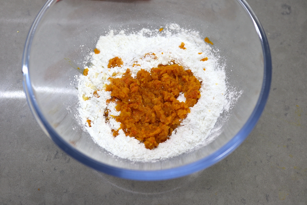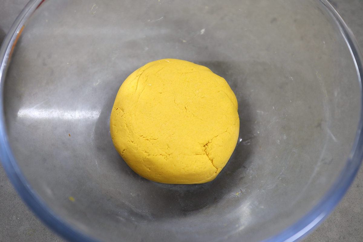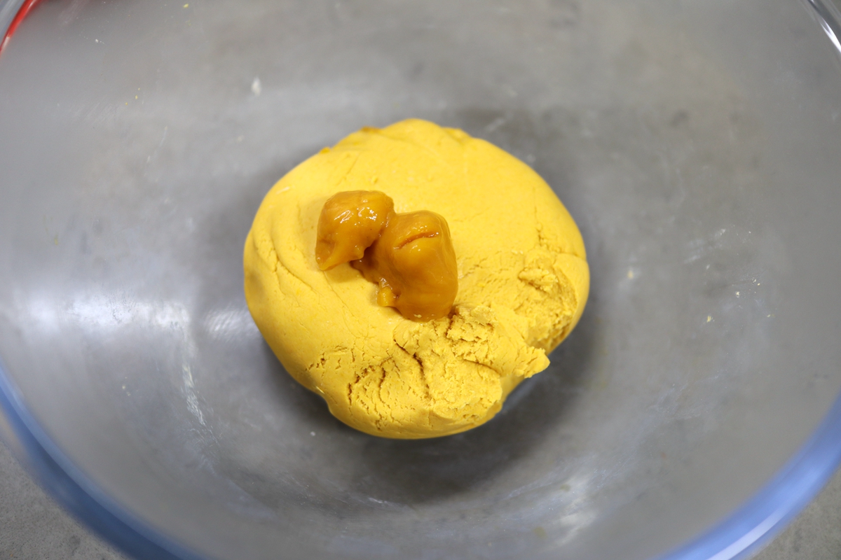 材料:糯米粉100克,南瓜泥100克左右,甜白豆沙馅120克,马苏里拉奶酪60克