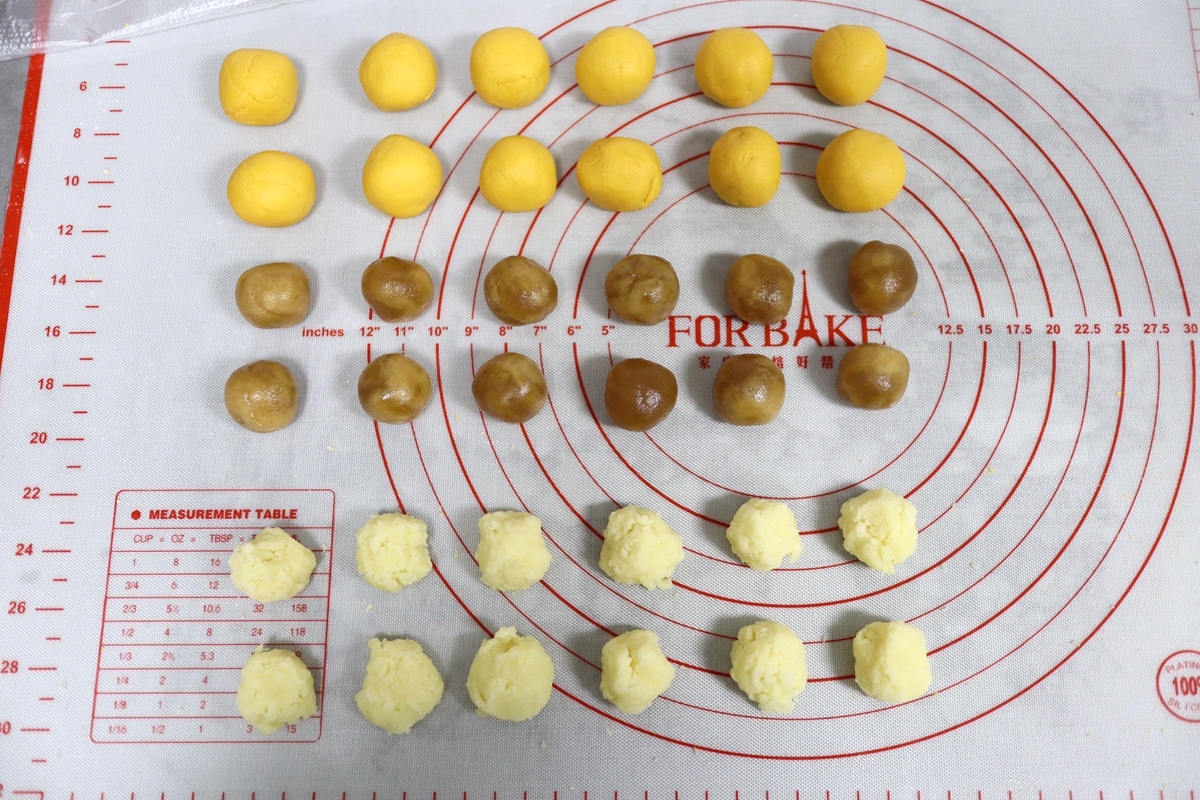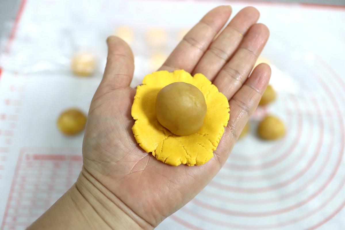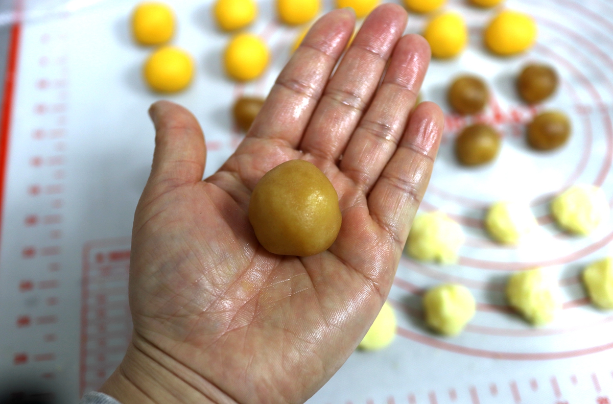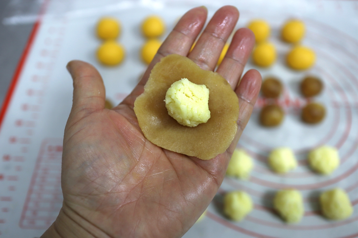 黑芝麻馅什么的都吃腻了,既然创新就创到底,索性连内馅也来个与众不同的吧!上次做披萨还剩下一些马苏里拉奶酪,正好放这里面当内馅,吃的时候会有长长的拉丝,目测有20厘米不算短吧。马苏里拉奶酪有微咸,而且是切好细丝的奶酪更不易成团,为了防止煮的时候破漏,我又用甜的白豆沙馅给包裹了一下,这样在口感上也丰富了。这金灿灿的汤圆特别受小朋友喜欢,连吃带玩吃了一碗,还说让我再多做一些才过瘾。