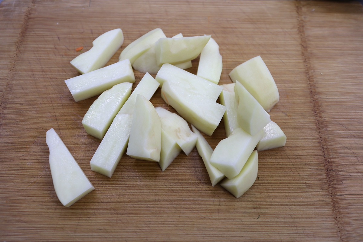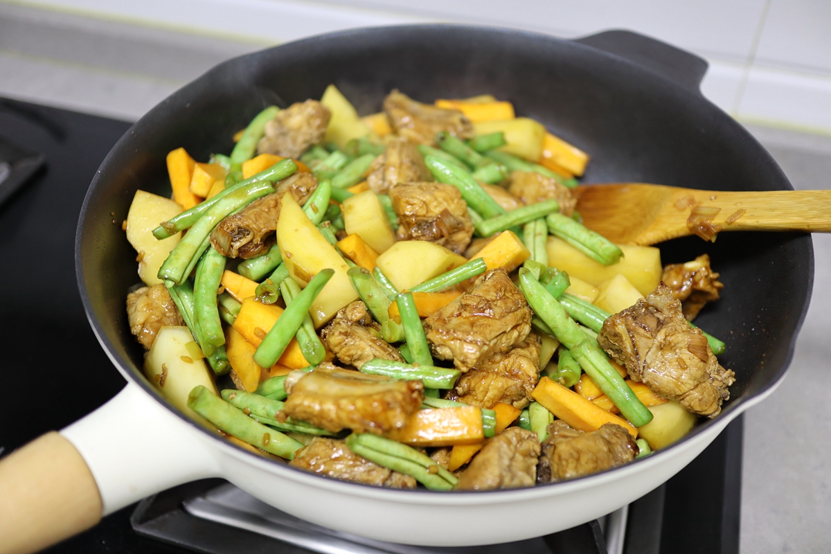 排骨扁豆焖面是北京人很传统的一道家常美食,我们所说的扁豆是所有豆角的统称,虽然有长有短有圆有扁,但我们统统称之为扁豆。把做这道焖面所用的扁豆头尾掐掉,撕去老筋,顺手撅成段;排骨看着块不小,但其实肉并不厚而且嫩,所以焖20-30分钟就能熟烂。加一个土豆同焖,在翻拌后土豆泥会裹在面条上,吃起来有沙沙的口感,比没有土豆泥的更有乐趣,同时营养也更丰富。
