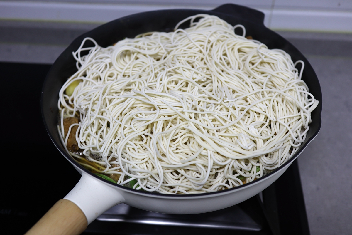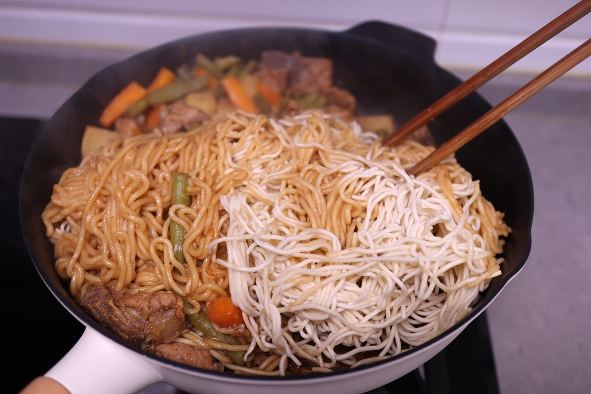 面条可以是手擀面,也可以是机压面。只是手擀面的含水量更大些,所以在焖制后口感更柔软些;机压面着汤汁的部分会柔软,上面无汤的部分要偏干一些,解决的办法可以是在上面淋一些水,或者将炖菜的汤汁提前舀一碗出来,中途的时候淋在面条表面,柔软又入味。吃时可淋香醋和辣椒油更具风味。