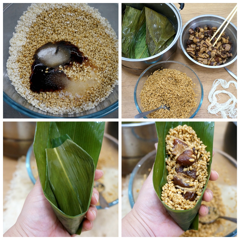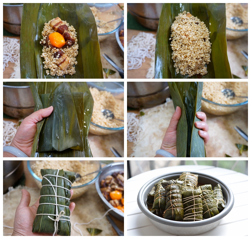 5. 左手托起3张粽叶,先舀一些糯米放在上面,再摆放两块肉和一颗咸蛋黄;