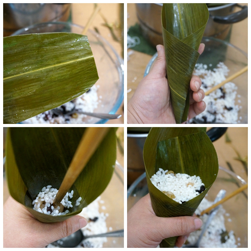 8. 再将底下的粽叶分别向中间对折,注意将糯米压住;
