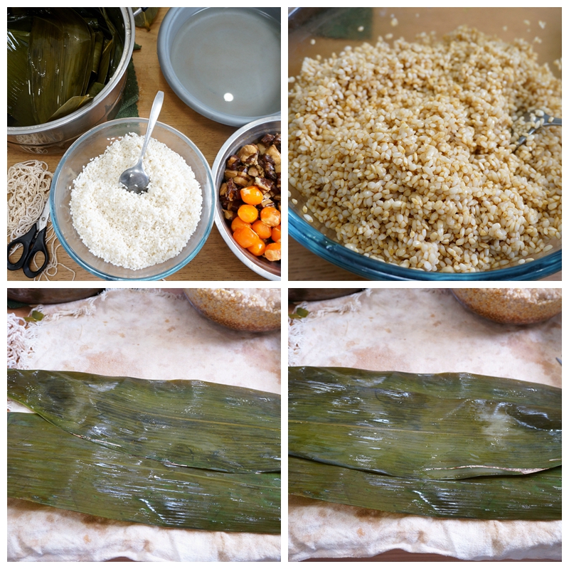 1. 个人觉得圆粒糯米比长粒糯米更加粘糯,清洗干净后用凉水泡4个小时左右,待米粒吸足水后可使用,干粽子叶清洗干净,泡凉水中浸泡至少3个小时才好用;