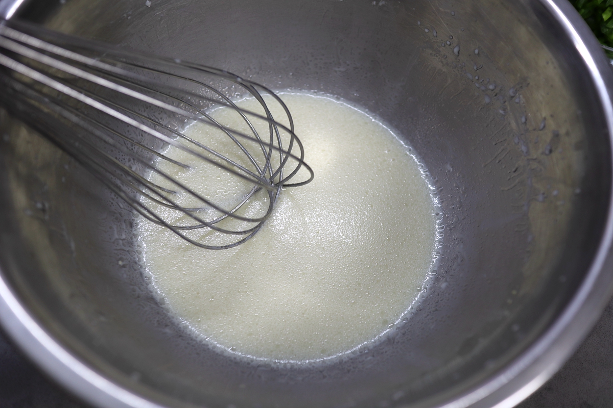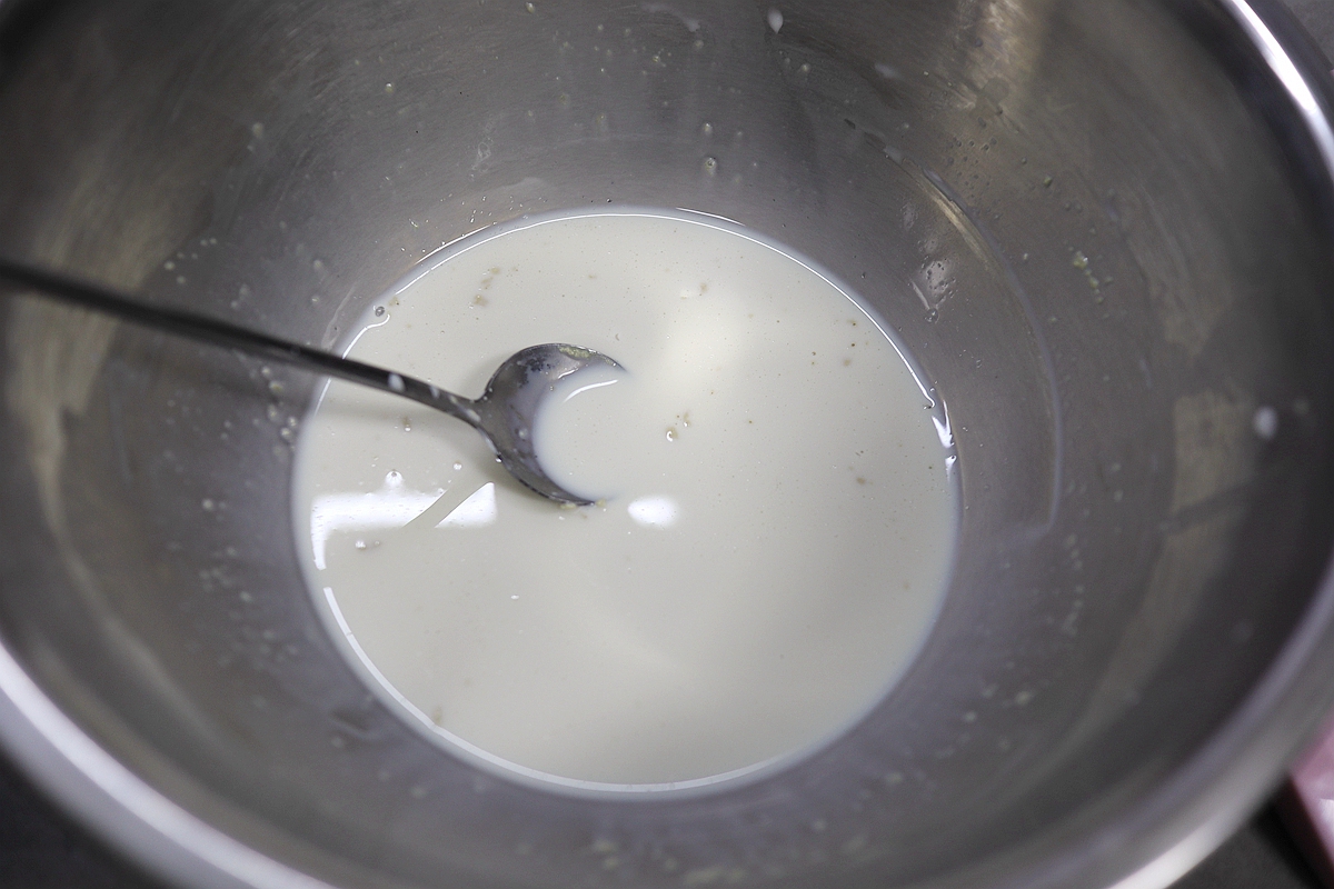 3. 植物油、盐入牛奶酵母液中,用手抽搅打均匀,无明显油星;