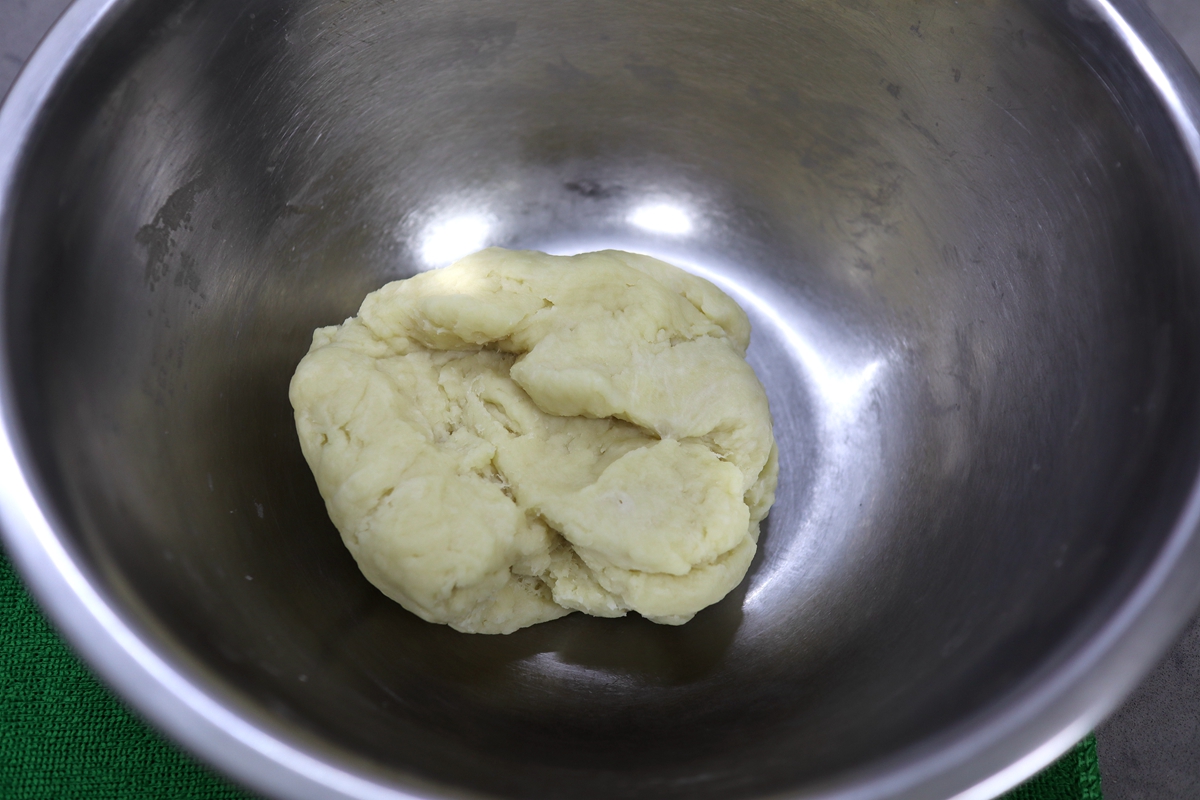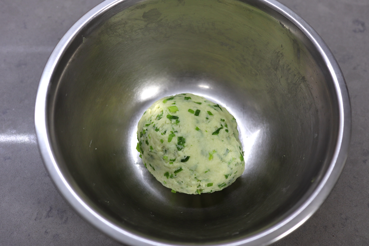 5. 将香葱末入盆中,稍微揉一揉成团,蒙保鲜膜松弛20分钟;面团不是我们做面包那样的滋润柔软,能成团却略有些干;