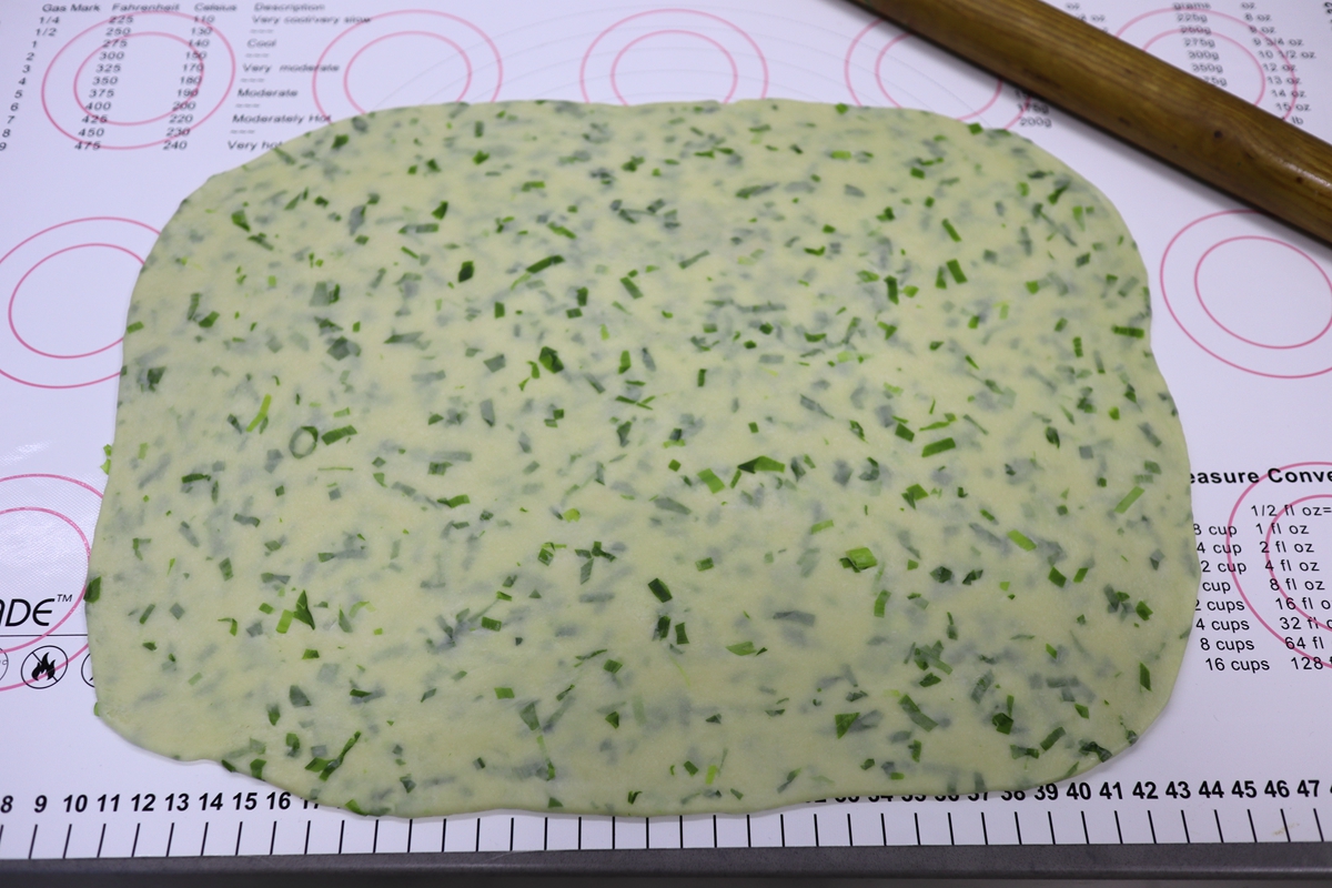 6. 松弛之后的香葱面团柔软了很多,把面团放在揉面垫上,用擀面杖擀成厚约1-2毫米的长方形薄片;