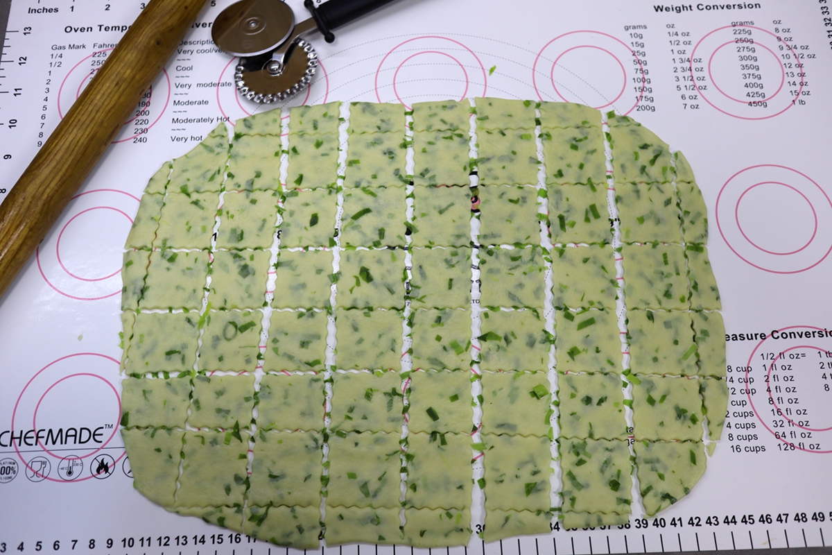 7. 用擀面杖当尺子,用波纹滚刀切割成大小均匀的方块;