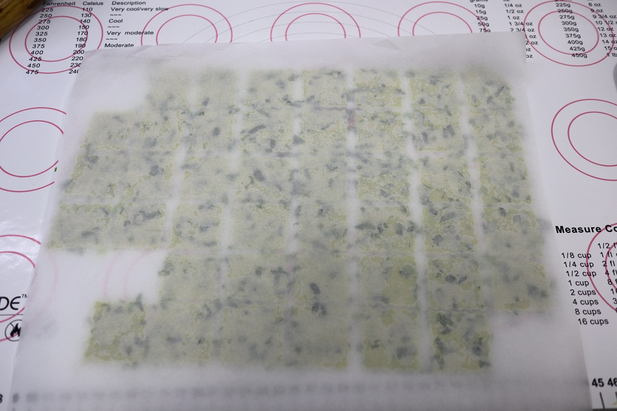 8. 去掉不漂亮的生坯块,将油纸覆盖在生坯上,再将学厨无边烤盘压在油纸上,将硅胶垫覆盖在烤盘上,反转;