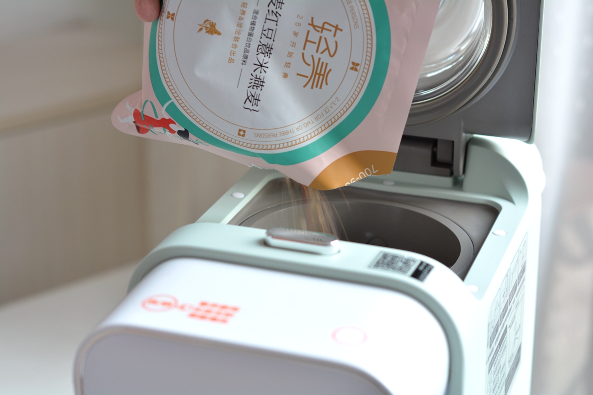 这台机器是免洗破壁豆浆机,自动匹配水量,因为是1-2人的量,所以料包的量不宜过多,以不超过35克为宜,如果料过多而水少,浆或者糊就会非常稠,所以可以用配套的量勺来量取。