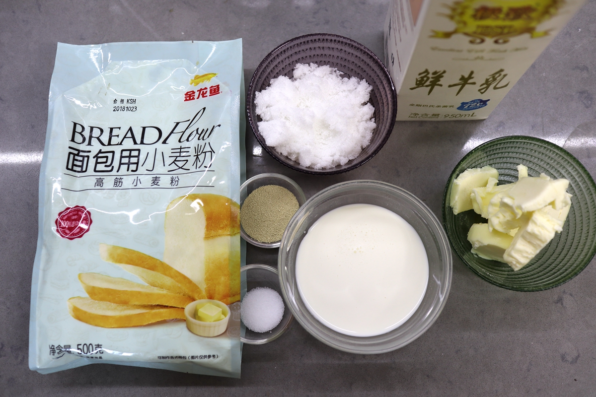 材料:高筋面粉500克,干酵母6克,白糖 50克,盐4克,淡奶油60克,牛奶300克,黄油60克