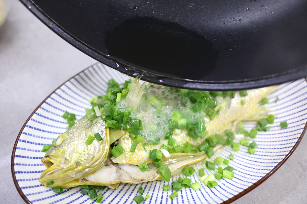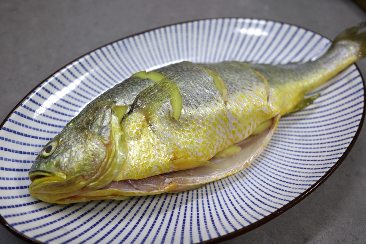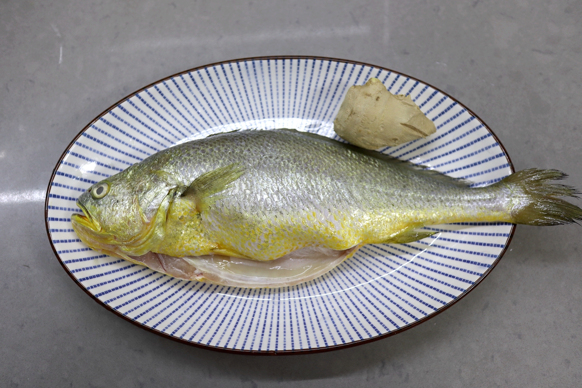 材料:黄花鱼1条,香葱5棵,姜1块,植物油20克,蒸鱼豉油40克,黄酒少许
