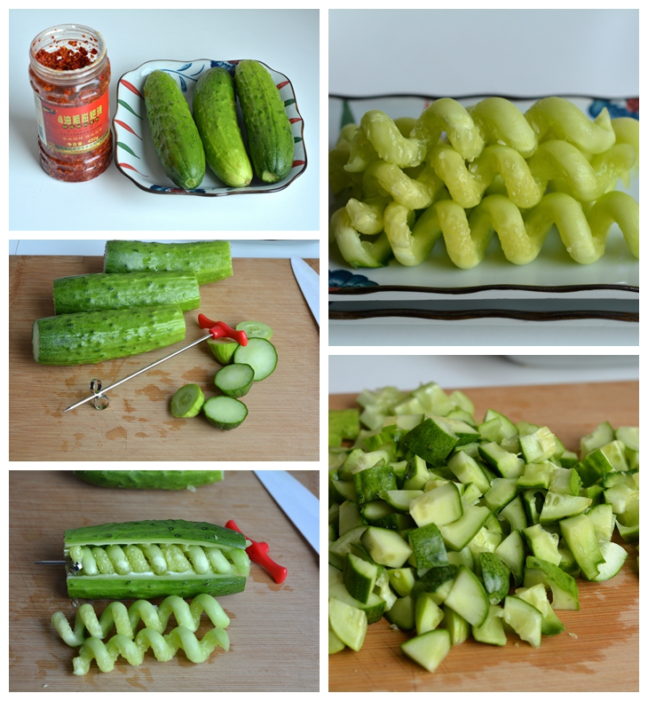3. 小工具从一端钻进黄瓜内,边转边钻,钻到另一头时用刀将黄瓜表皮划一刀,黄瓜瓤就如此妖娆了;