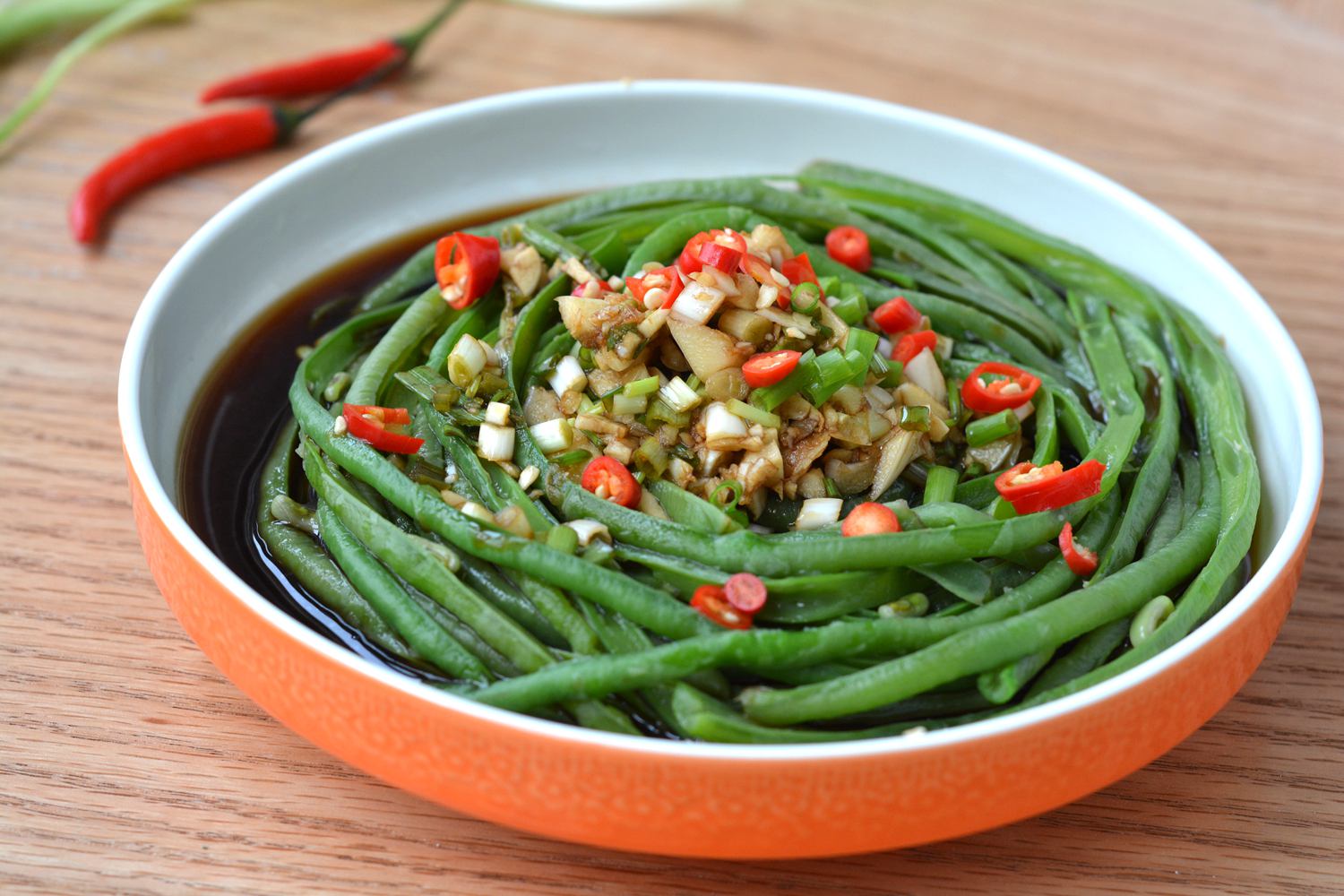 10. 将调好的料汁淋在豇豆上,再撒上小米辣,又漂亮,还能降低辣度。