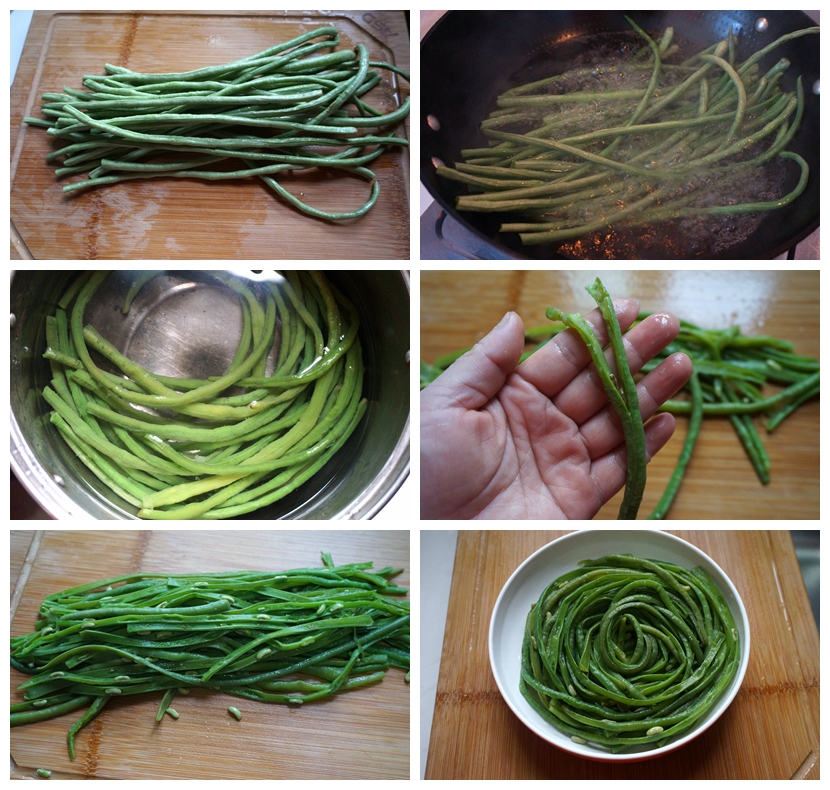 4. 顺着豇豆的经络,手撕成两条,豇豆只有充分煮熟煮软才能轻易撕开;