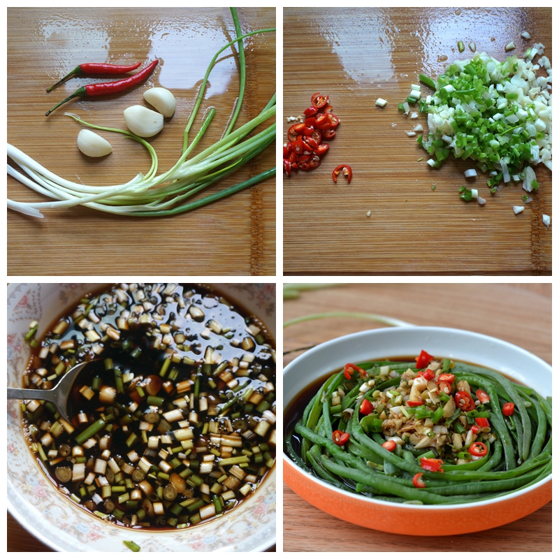 材料:豇豆一把,大蒜3瓣,香葱数棵,小米辣2个,醋、生抽、盐、白糖、白开水