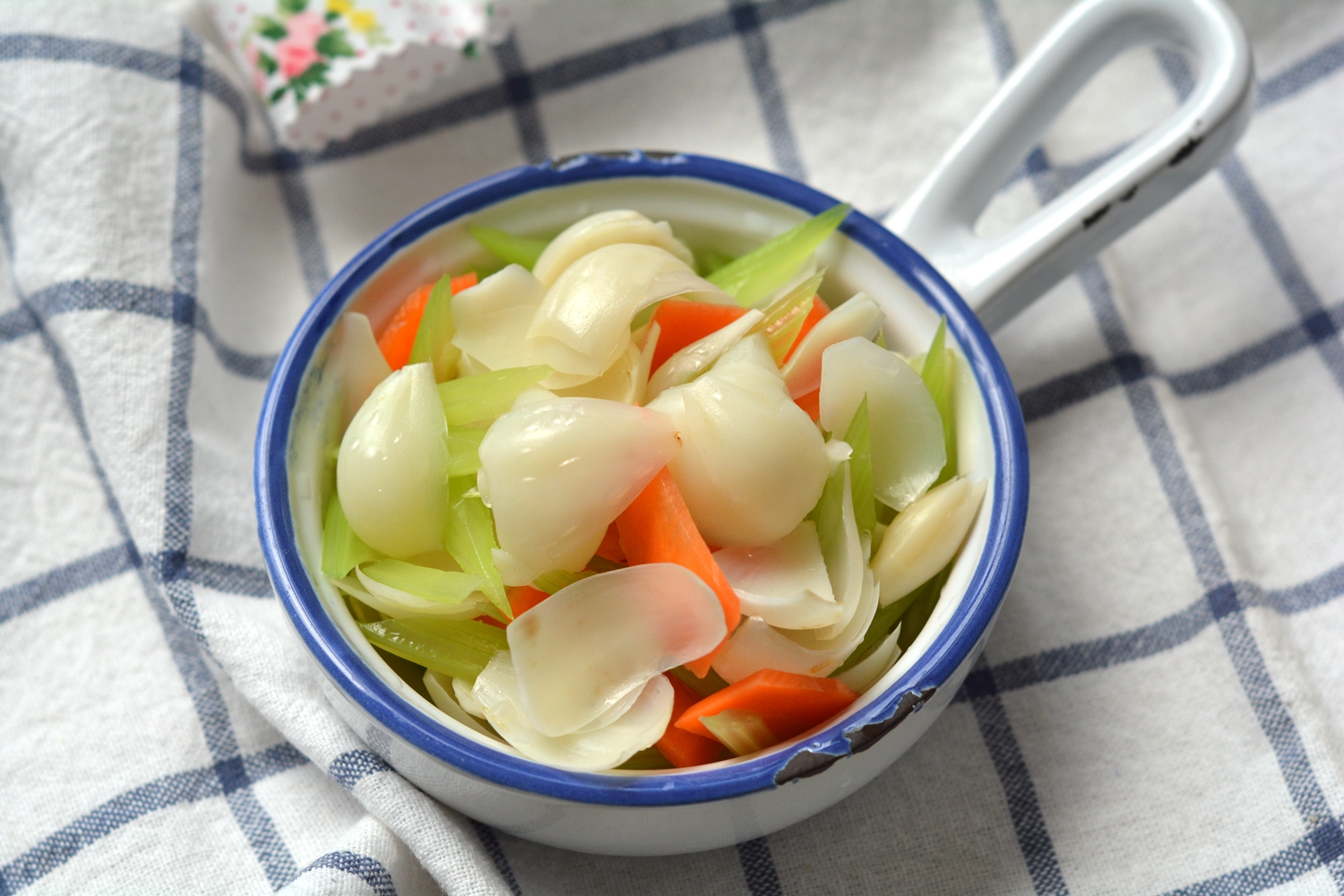 1. 芹菜只取去叶粗杆,胡萝卜半根,百合两头,清洗干净;可同时烧一锅水用来焯菜;