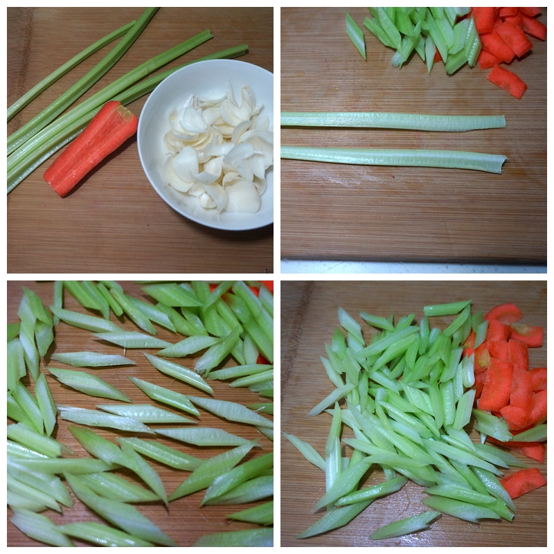 4. 全部芹菜都切好,胡萝卜切小薄片;