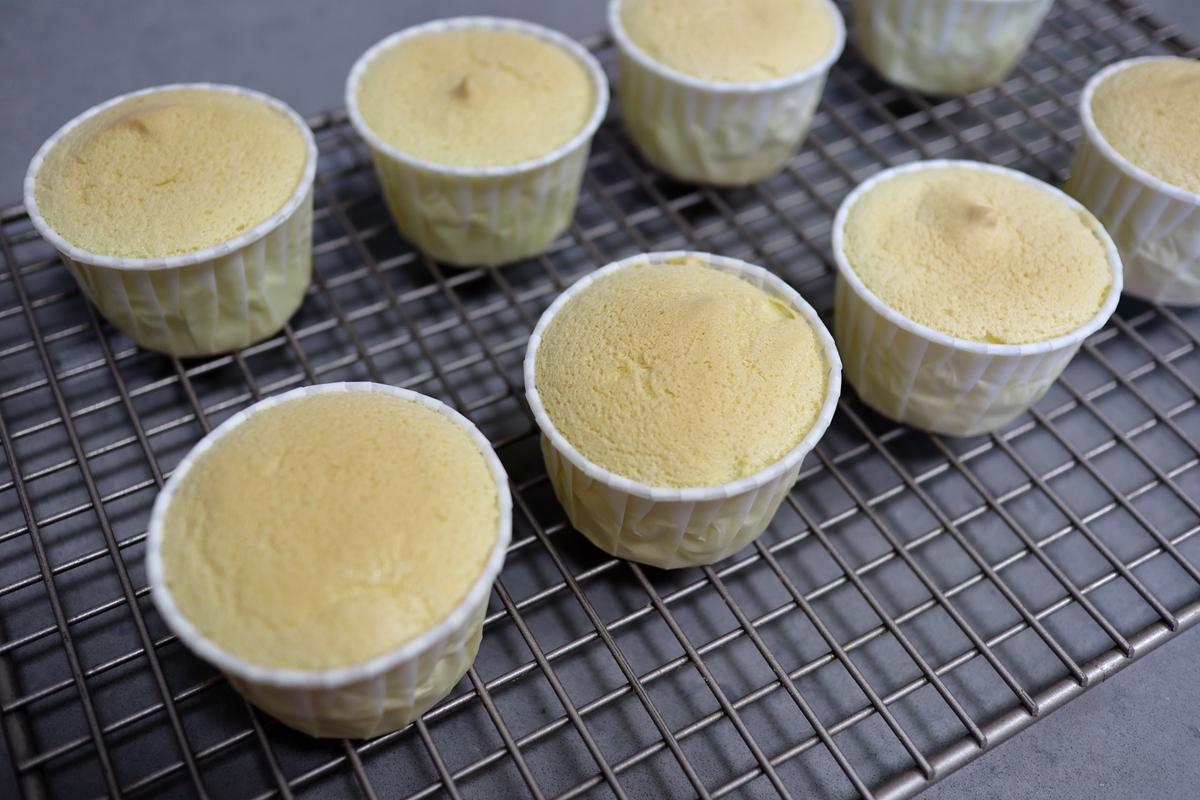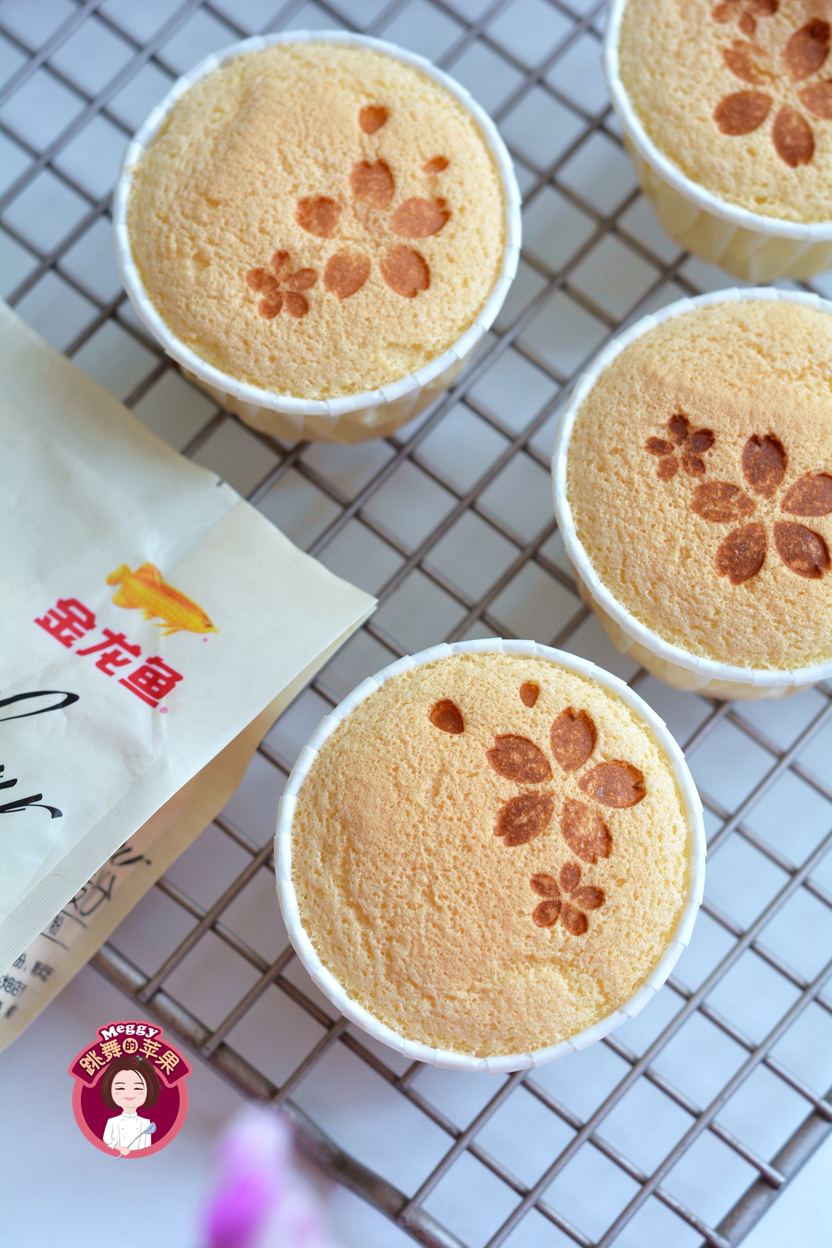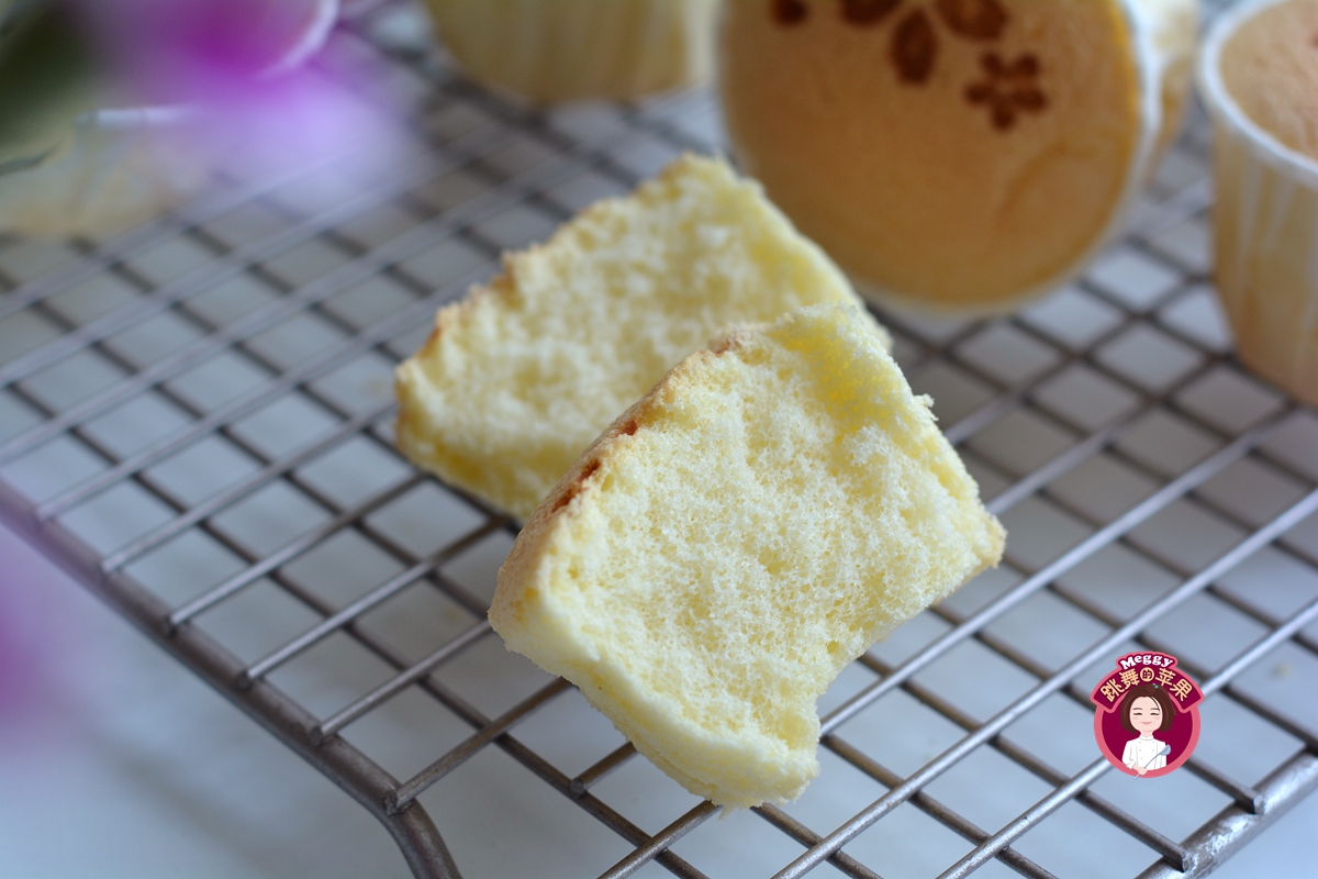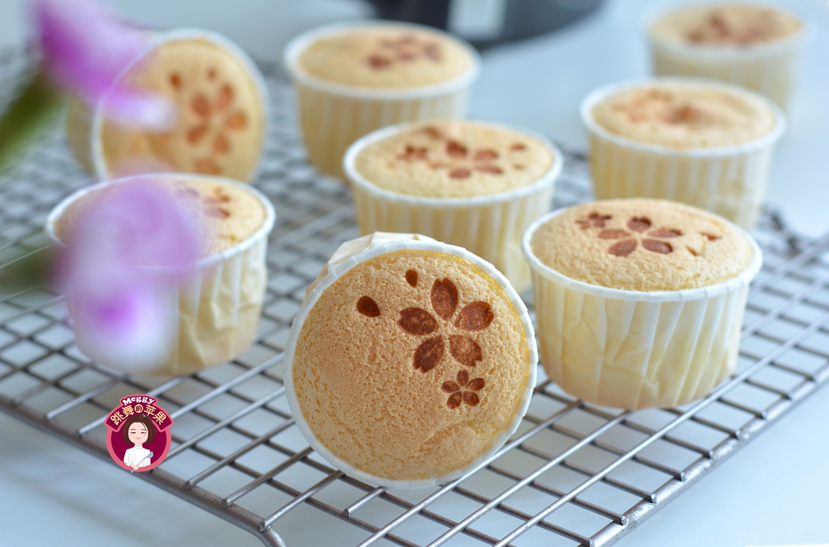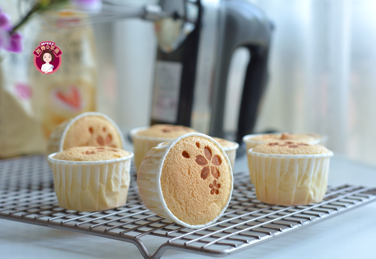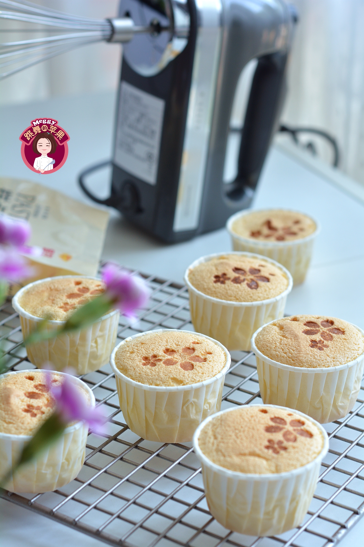蛋糕很普通,依然是戚风蛋糕的基础配方,以往我都用6寸或者8寸的模具来做,今天我想秀气点儿,用纸杯来烤,顺便再烙上几朵花,蛋糕一下子就精致了。想要蛋糕平整不开裂,几个要点掌握好:蛋白糊不宜过硬、粉类不宜过多、温度不宜过高。